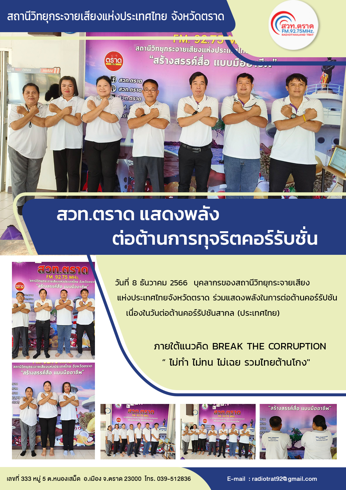 วันที่ 8 ธันวาคม 2566 บุคลากรของ สถานีวิทยุกระจายเสียงแห่งประเทศไทยจังหวัดตราด ร่วมแสดงพลังในการต่อต้านคอร์รัปชัน เนื่องในวันต่อต้านคอร์รัปชันสากล (ประเทศไทย) วันที่ 9 ธันวาคม 2566 ภายใต้แนวคิด BREAK THE CORRUPTION “ ไม่ทำ ไม่ทน ไม่เฉย รวมไทยต้านโกง"