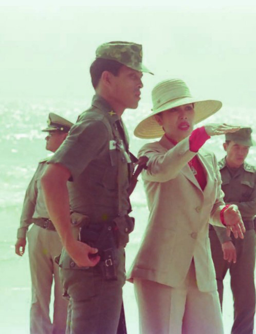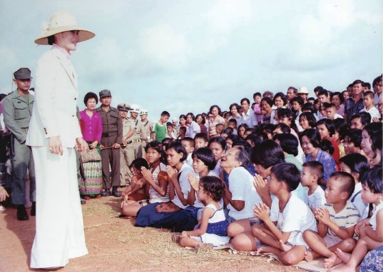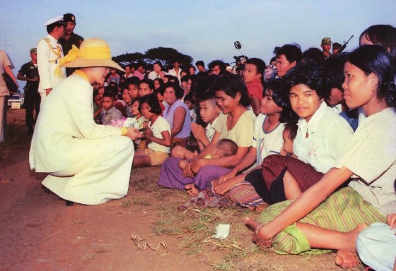 สมเด็จพระนางเจ้าสิริกิติ์ พระบรมราชินีนาถ พระบรมราชชนนีพันปีหลวง องค์สภานายิกาสภากาชาดไทย พร้อมด้วย พระบาทสมเด็จพระปรเมนทรรามาธิบดีศรีสินทร มหาวชิราลงกรณฯ พระวชิรเกล้าเจ้าอยู่หัว เมื่อครั้งดำรงพระราชอิสริยยศเป็นสมเด็จพระบรมโอรสาธิราชฯ สยามมกุฎราชกุมาร เสด็จพระราชดำเนินมาเยี่ยมผู้อพยพและเจ้าหน้าที่ ณ ค่ายผู้อพยพ ศูนย์สภากาชาดไทย เขาล้าน ในระหว่างวันที่ ๒๒ - ๒๓ สิงหาคม พ.ศ. ๒๕๒๒ (ภาพพระราชทาน)