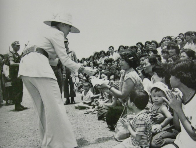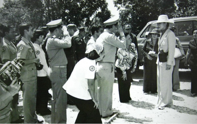 สมเด็จพระนางเจ้าสิริกิติ์ พระบรมราชินีนาถ พระบรมราชชนนีพันปีหลวง องค์สภานายิกาสภากาชาดไทย เสด็จพระราชดำเนิน โดยเครื่องบินพระที่นั่งมายังสนามบินจังหวัดตราด เพื่อประทับรถยนต์พระที่นั่งไปยังค่ายผู้อพยพศูนย์สภากาชาดไทย เขาล้าน เมื่อวันที่ ๒๒ สิงหาคม พ.ศ. ๒๕๒๒ (ภาพจากสภาชาดไทย)