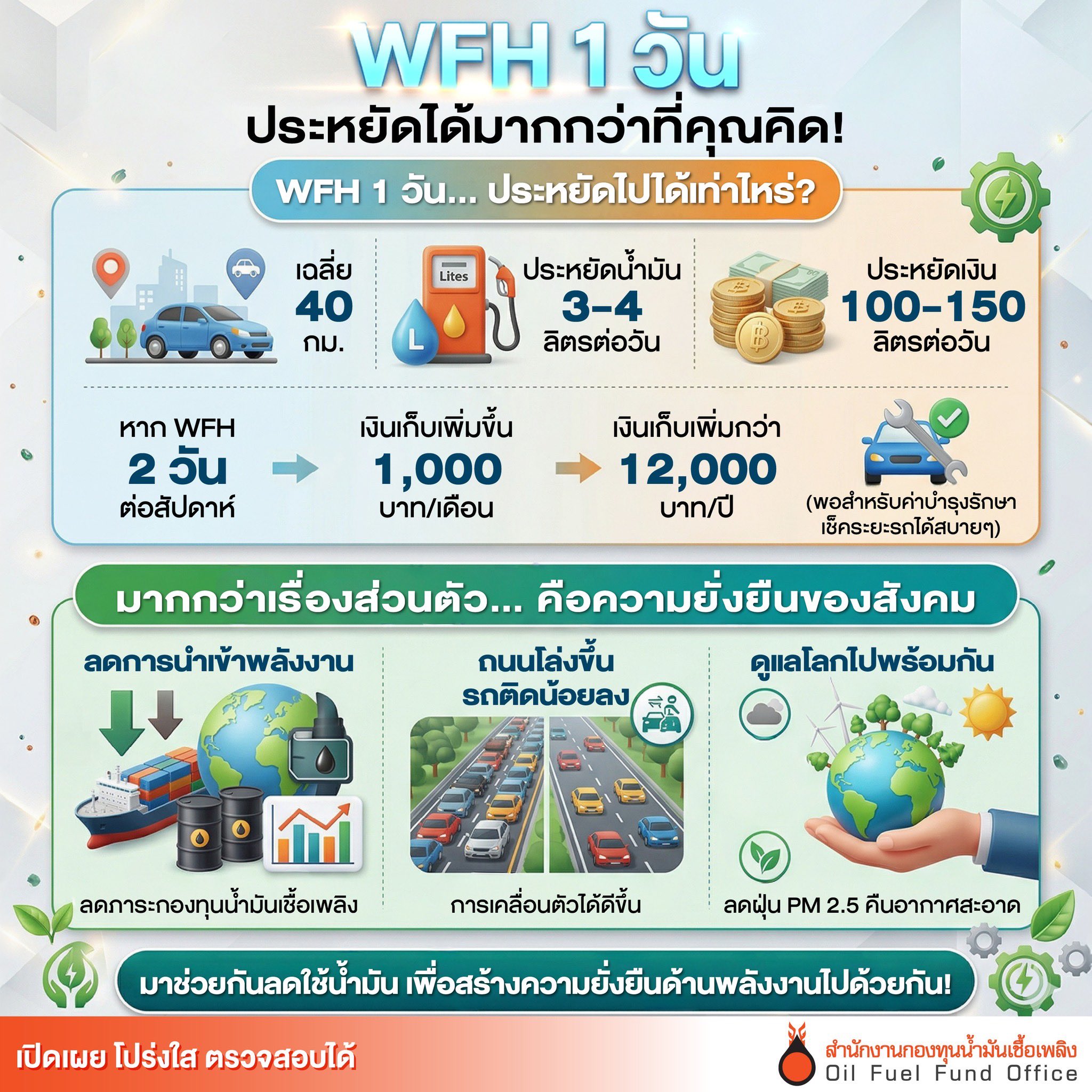 ในช่วงสถานการณ์วิกฤตพิษสงครามตะวันออกกลาง ยังส่งผลกระทบต่อราคาพลังงานในประเทศไทย ราคาน้ำมันยังคงผันผวน และสร้างภาระค่าใช้จ่ายที่สูงขึ้น การทำงานที่บ้าน (Work From Home) ไม่ใช่แค่ทางเลือกเพื่อความสะดวกสบายและประหยัดน้ำมันเท่านั้น แต่รู้ไหมว่า... การลดการใช้รถเพียง 1-2 วันต่อสัปดาห์ ส่งผลบวกทั้งต่อ "เงินในกระเป๋า" และ "ความมั่นคงทางพลังงาน" ของประเทศอย่างคาดไม่ถึง!