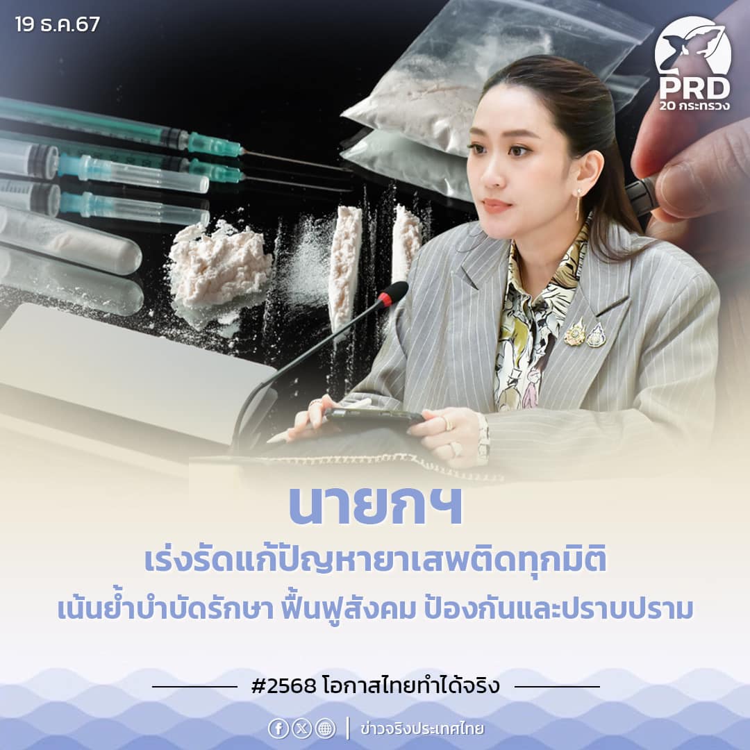 นางสาวแพทองธาร ชินวัตร นายกรัฐมนตรี เป็นประธานการประชุมศูนย์ปฏิบัติการติดตามเร่งรัดการบำบัดรักษาฟื้นฟูสภาพสังคม ป้องกัน และปราบปรามยาเสพติด ครั้งที่ 2/2567 ร่วมกับผู้ว่าราชการจังหวัดทั่วประเทศ ผ่านระบบ Cisco Webex Meetings เพื่อรับทราบการจัดทำ Dashboard ที่จะอัปเดตฐานข้อมูลกลางของสถานการณ์ยาเสพติด และพัฒนาเชื่อมโยงระหว่างหน่วยงานต่าง ๆ ที่ได้ดำเนินการแล้วร้อยละ 80 พร้อมมอบหมายให้นายภูมิธรรม เวชยชัย รองนายกรัฐมนตรีและรัฐมนตรีว่าการกระทรวงกลาโหม และ พ.ต.อ.ทวี สอดส่อง รัฐมนตรีว่าการกระทรวงยุติธรรม เร่งขับเคลื่อนนโยบาย และพัฒนาแพลตฟอร์มออนไลน์ที่ปิดเป็นความลับของผู้ให้ข้อมูล (ไม่เปิดเผยผู้แจ้งเบาะแส) เพื่อให้ประชาชนสามารถแจ้งปัญหายาเสพติดได้โดยตรงกับนายกรัฐมนตรีอย่างปลอดภัยให้แล้วเสร็จโดยเร็ว และนายกรัฐมนตรีเน้นย้ำถึงเป้าหมาย แนวทาง ตัวชี้วัดที่ชัดเจนในทุกด้าน โดยเฉพาะ 10 จังหวัดเป้าหมายให้แก้ไขปัญหาตาม Model ที่ถอดแบบมาจาก อ.ท่าวังผา จ.น่าน และ อ.ธวัชบุรี จ.ร้อยเอ็ด ให้เห็นผลเป็นรูปธรรมโดยเร็ว และทำให้ 90 วันยาเสพติดหมดไปจากพื้นที่