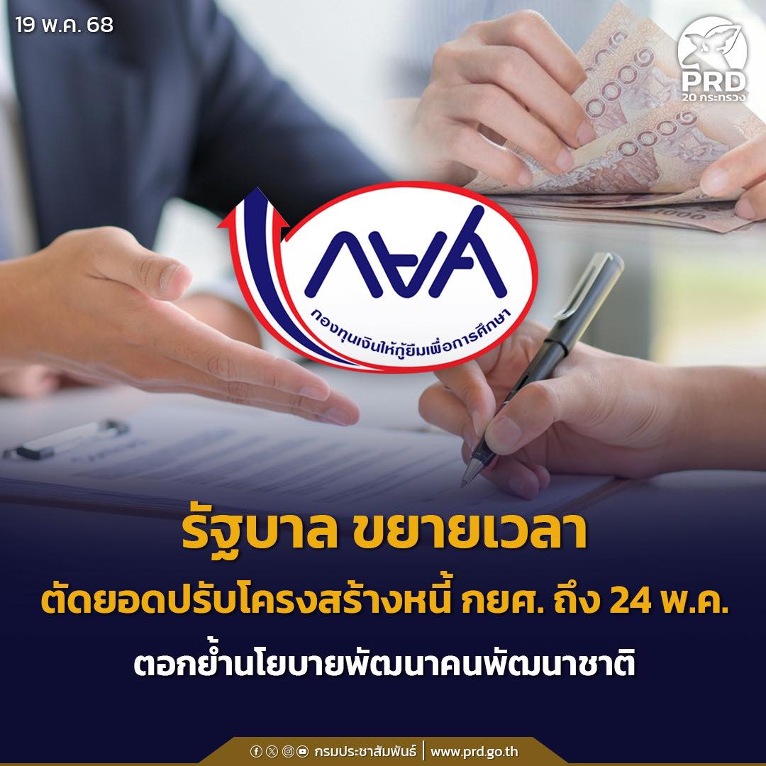 รัฐบาลให้ความสำคัญในการแก้ปัญหาหนี้ของกองทุนเงินให้กู้ยืมเพื่อการศึกษา (กยศ.) เพื่อมุ่งหวังให้นักเรียน นิสิต และนักศึกษา ได้รับการศึกษาเรียนจบมาเป็นกำลังสำคัญในการพัฒนาประเทศ และได้รับเงินจากการชำระหนี้ นำมาส่งต่อโอกาสทางการศึกษาให้สู่รุ่นน้องต่อไป โดย กยศ. ได้ปรับโครงสร้างหนี้ใหม่ตามพระราชบัญญัติกองทุนเงินให้กู้ยืมเพื่อการศึกษา (ฉบับที่ 2) พ.ศ. 2566 ซึ่งเป็นการตัดลำดับการชำระหนี้ใหม่เป็น “เงินต้น – ดอกเบี้ย – เบี้ยปรับ” แทนแบบเดิมพร้อมลดอัตราเบี้ยปรับจากสูงสุดร้อยละ 18 เหลือเพียงร้อยละ 0.5 การคำนวณหนี้แบบใหม่นี้ ครอบคลุมผู้กู้ ประมาณ 3.5 ล้านราย กยศ. ดำเนินการได้แล้วกว่า 2.3 ล้านราย หรือประมาณร้อยละ 70 สำหรับลูกหนี้ กยศ. ที่ยังไม่ลงทะเบียนหรือดำเนินการปรับโครงสร้างหนี้ตามสิทธิที่ได้รับนั้น กยศ. ได้ขยายระยะเวลาในการตัดยอดประจำเดือนพฤษภาคม 2568 จากเดิมวันที่ 17 เป็นวันที่ 24 พฤษภาคม 2568 ส่วนลูกหนี้ กยศ. ที่ปรับโครงสร้างหนี้แล้ว และอยู่ในระบบหักเงินเดือนผ่านองค์กรนายจ้างจะต้องแจ้งให้นายจ้างทราบด้วย เพื่อไม่ให้ถูกหักเงินเพิ่มอีก 3,000 บาทในเดือนนั้น ส่วนผู้กู้ที่ยังคงมียอดค้างชำระและยังไม่ได้ติดต่อ ขอทำสัญญาปรับโครงสร้างหนี้ กยศ. ยังคงต้องแจ้งให้หักเงินเดือนเพิ่ม 3,000 บาทต่อบัญชี ในเดือนพฤษภาคม 2568 และเดือนต่อไปจนกว่าจะไม่มียอดค้างชำระ จึงขอให้ผู้กู้ยืมชำระยอดหนี้ที่ค้างหรือติดต่อขอทำสัญญา ปรับโครงสร้างหนี้ออนไลน์ภายในวันที่ 5 กรกฎาคม 2568 ซึ่งเป็นวันครบกำหนดชำระของงวดปี 2568