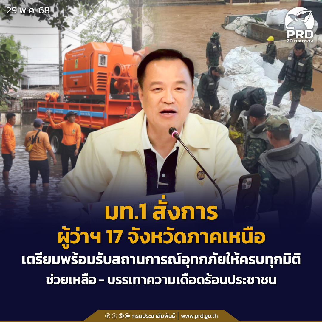 (27 พ.ค. 68) จากสถานการณ์อุทกภัยในหลายพื้นที่โดยเฉพาะภาคเหนือ นายอนุทิน ชาญวีรกูล รองนายกรัฐมนตรีและรัฐมนตรีว่าการกระทรวงมหาดไทย ได้ประชุมและมีข้อสั่งการเตรียมความพร้อม และรับมือสถานการณ์อุทกภัย มีหนังสือด่วนแจ้งไปยังผู้ว่าราชการจังหวัด 17 จังหวัดภาคเหนือ ให้บริหารจัดการสถานการณ์อุทกภัยอย่างมีประสิทธิภาพ เตรียมความพร้อมก่อนเกิดภัย ขณะเกิดภัย และหลังเกิดภัย เพื่อเร่งช่วยเหลือฟื้นฟูเยียวยาอย่างรวดเร็วและทั่วถึง และสื่อสารสร้างความเข้าใจกับประชาชนให้ติดตามสภาพอากาศอย่างต่อเนื่อง