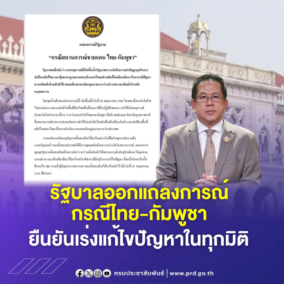 แถลงการณ์รัฐบาล “กรณีสถานการณ์ชายแดน ไทย-กัมพูชา” รัฐบาลขอยืนยันว่า จากเหตุการณ์ที่เกิดขึ้น รัฐบาลตระหนักถึงความสำคัญสูงสุดในการปกป้องอธิปไตยและคุ้มครองบูรณภาพของดินแดนไทยอย่างเต็มที่โดยยึดหลักการในการแก้ปัญหาความขัดแย้งด้วยสันติวิธี สอดคล้องตามหลักกฎหมายระหว่างประเทศ และยึดมั่นในหลักมนุษยธรรม
