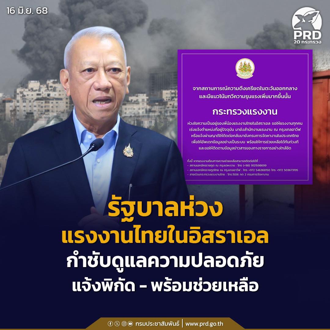 จากสถานการณ์ความตึงเครียดในตะวันออกกลางระหว่างอิสราเอลกับอิหร่าน นายกรัฐมนตรีได้สั่ง การให้กระทรวงแรงงาน กระทรวงการต่างประเทศ และกระทรวงกลาโหม เตรียมการช่วยเหลือแรงงานไทย โดยกระทรวงแรงงานเร่งดำเนินการ 3 ด้าน ได้แก่ 1. ติดตามความปลอดภัยของแรงงานไทยในอิสราเอลทุกพื้นที่ 2. ประสานกับนายจ้างและบริษัทจัดหางาน เตรียมพื้นที่ปลอดภัยและแผนอพยพกรณีฉุกเฉิน 3. ขอให้แรงงานทุกคนเร่งแจ้งตำแหน่งที่อยู่ปัจจุบัน เพื่อพร้อมให้การช่วยเหลือได้ทันท่วงที ซึ่งปัจจุบันมีแรงงานไทยทำงานอยู่ในอิสราเอลประมาณ 40,000 คน ส่วนกระทรวงการต่างประเทศได้เริ่มดำเนินการตั้งศูนย์ประสานงานสถานการณ์ฉุกเฉิน (Rapid Response Center: RRC) แล้ว เพื่อประสานงานกับหน่วยงานต่าง ๆ และสถานเอกอัครราชทูต ในภูมิภาคที่เกี่ยวข้อง เพื่อช่วยเหลือคนไทยในกรณีจำเป็น และประสานกับกระทรวงกลาโหมเตรียมพร้อมที่จะอพยพหากสถานการณ์รุนแรงขึ้น แรงงานไทยสามารถขอความช่วยเหลือได้ที่ สถานเอกอัครราชทูต ณ กรุงเตหะราน โทร (+98) 9121598699 สถานเอกอัครราชทูตไทย ณ กรุงเทลอาวีฟ โทร +972 546368150 และกรมการจัดหางาน กระทรวงแรงงานไทย โทร 1506 กด 2