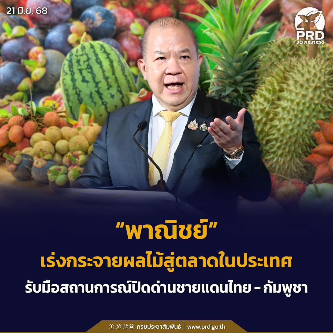 (19 มิ.ย. 68) จากสถานการณ์ความไม่สงบบริเวณชายแดนกัมพูชา ส่งผลให้มีการปิดด่านการค้าบางจุด ทำให้การกระจายผลไม้จากจังหวัดภาคตะวันออกที่ส่งออกไปยังประเทศเพื่อนบ้านชะลอลง กระทรวงพาณิชย์มอบหมายให้กรมการค้าภายในลงพื้นที่ติดตามสถานการณ์อย่างใกล้ชิด และเร่งผลักดันการระบายผลผลิตภายในประเทศ โดยร่วมกับหน่วยงานและภาคเอกชนต่าง ๆ เร่งกระจายผลไม้ช่วงปลายฤดูกาลเก็บเกี่ยว ตั้งเป้าระบายผลไม้จำนวน 3,000 ตัน ผ่านห้างค้าปลีกขนาดใหญ่ เครือข่ายห้างค้าปลีกท้องถิ่นทั่วประเทศ และเตรียมจัดกิจกรรม “Thai Fruits Festival 2025” ที่จังหวัดภูเก็ต ในช่วงเดือนกรกฎาคมขณะที่ กรมการค้าภายในยังได้จับมือกับบริษัท ไปรษณีย์ไทย จำกัด จัดส่งผลไม้ให้ฟรีทั่วประเทศ สำหรับการซื้อขายผ่านทางออนไลน์ และจัดเตรียมบรรจุภัณฑ์ผลไม้ DIT ทั้งกล่องและตะกร้า รวม 238,000 ชิ้น ช่วยลดต้นทุนการจัดส่งให้แก่เกษตรกรและผู้ประกอบการ โดยทยอยกระจายไปยังสำนักงานพาณิชย์จังหวัดทั่วประเทศ ย้ำขอให้มั่นใจรัฐบาลและกระทรวงพาณิชย์ จะดูแลด้านราคาและตลาดอย่างต่อเนื่อง