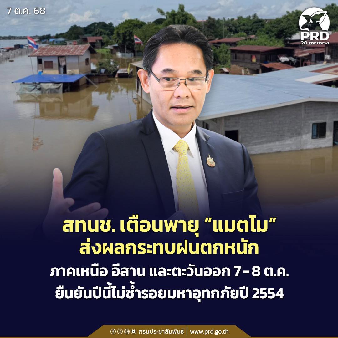 สทนช. เตือนพายุ “แมตโม” ส่งผลกระทบฝนตกหนัก ภาคเหนือ อีสาน และตะวันออก 7-8 ต.ค. ยืนยันปีนี้ไม่ซ้ำรอยมหาอุทกภัยปี 2554