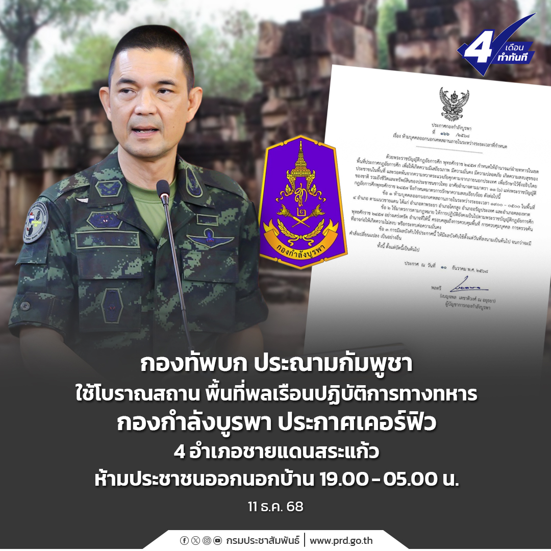 กองทัพบก ประณามกัมพูชา ใช้โบราณสถาน พื้นที่พลเรือนปฏิบัติการทางทหาร กองกำลังบูรพา ประกาศเคอร์ฟิว 4 อำเภอชายแดนสระแก้ว ห้ามประชาชนออกนอกบ้าน 19.00 - 05.00 น.