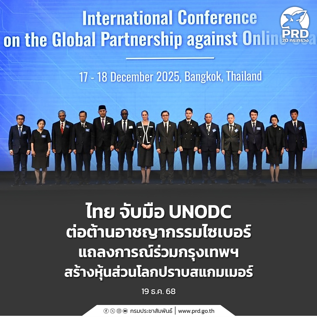 การประชุมระหว่างประเทศว่าด้วยหุ้นส่วนระดับโลกเพื่อต่อต้านอาชญากรรมหลอกลวงทางอินเทอร์เน็ต ซึ่งประเทศไทยเป็นผู้ริเริ่มและเป็นเจ้าภาพจัดขึ้นร่วมกับสำนักงานว่าด้วยยาเสพติดและอาชญากรรมแห่งสหประชาชาติ (UNODC) ระหว่างวันที่ 17–18 ธันวาคม 2568 โดยมีผู้เข้าร่วมทั้งในระดับรัฐมนตรี ปลัดกระทรวง อธิบดี เอกอัครราชทูตจากทุกภูมิภาคทั่วโลก ผู้แทนจากสหภาพยุโรป องค์การระหว่างประเทศ ภาคประชาสังคม และนักวิชาการ รวมทั้งสิ้นมากกว่า 300 คน จาก 60 ประเทศ เพื่อเสริมสร้างความเป็นหุ้นส่วนระดับโลกในการต่อต้านอาชญากรรมหลอกลวงทางอินเทอร์เน็ต โดยนายสีหศักดิ์ พวงเกตุแก้ว รัฐมนตรีว่าการกระทรวงการต่างประเทศ ได้เน้นย้ำว่า การหลอกลวงทางอินเทอร์เน็ตพัฒนาเป็นอาชญากรรมข้ามชาติขนาดใหญ่ที่ก่อให้เกิดความเสียหายทางเศรษฐกิจ และเชื่อมโยงกับการละเมิดสิทธิมนุษยชน การค้ามนุษย์ การใช้แรงงานบังคับ และอาชญากรรมข้ามชาติในรูปแบบอื่น ๆ โดยไทยมีการดำเนินการเชิงรูปธรรม มีเป้าหมายเพื่อรื้อถอนเครือข่ายอาชญากรรม ขณะที่นายอนุทิน ชายวีรกูล นายกรัฐมนตรีและรัฐมนตรีว่าการระทรวงมหาดไทย ระบุว่านานาชาติให้ความสำคัญในการแก้ปัญหาอาชญากรรมออนไลน์ พร้อมเน้นย้ำประเทศไทยจริงจังในการปราบสแกมเมอร์ เดินหน้าขับเคลื่อนความร่วมมือกับ ทุกประเทศสู่การปฏิบัติอย่างเป็นรูปธรรม ที่ประชุมฯ ยังได้รับรอง “แถลงการณ์ร่วมกรุงเทพฯ” โดยมีประเทศต่าง ๆ อาทิ เปรู บังกลาเทศ สหรัฐอาหรับเอมิเรตส์ เนปาล และภาคเอกชน เช่น TikTok ร่วมสนับสนุนเพื่อย้ำเจตนารมณ์ ในการยกระดับความร่วมมือระหว่างประเทศอย่างเป็นรูปธรรม ทั้งการแลกเปลี่ยนข้อมูลและพยานหลักฐาน การคุ้มครองผู้เสียหาย และการทำงานร่วมกับภาคเอกชนในการป้องกัน ตรวจจับ และลดการแพร่กระจายของการหลอกลวงออนไลน์อย่างมีประสิทธิภาพ ซึ่งการประชุมครั้งนี้ยังได้รับเสียงชื่นชมจากนานาชาติ โดยเฉพาะบทบาท เชิงรุกของประเทศไทยในการขับเคลื่อนความร่วมมือเพื่อต่อต้านการหลอกลวงทางอินเทอร์เน็ต (online scams) โดยประเทศไทยมีความมุ่งมั่นในการต่อต้านอาชญากรรมหลอกลวงทางอินเทอร์เน็ตอย่างจริงจัง โดยกำหนดให้เป็นวาระแห่งชาติ เนื่องจากส่งผลให้เกิดความเสียหายอย่างร้ายแรงทั้งต่อมนุษย์และระบบเศรษฐกิจโลก ไม่มีประเทศใดสามารถแก้ไขได้เพียงลำพัง จึงจำเป็นต้องอาศัยความร่วมมือระหว่างประเทศ