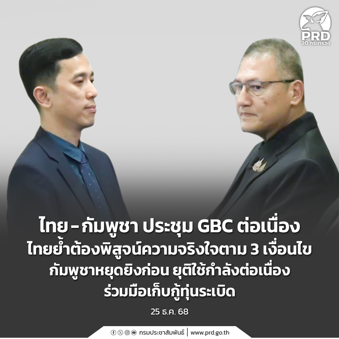 ไทย-กัมพูชา ประชุม GBC ต่อเนื่อง ไทยย้ำต้องพิสูจน์ความจริงใจตาม 3 เงื่อนไข กัมพูชาหยุดยิงก่อน ยุติใช้กำลังต่อเนื่อง ร่วมมือเก็บกู้ทุ่นระเบิด