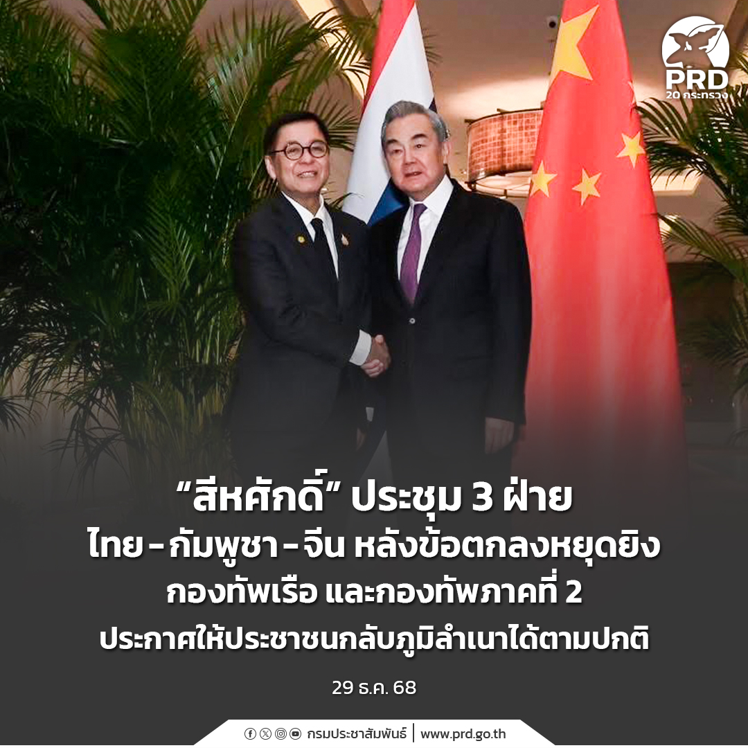 (28 ธ.ค. 68) นายสีหศักดิ์ พวงเกตุแก้ว รัฐมนตรีว่าการกระทรวงการต่างประเทศ พบหารือกับนายหวัง อี้ สมาชิกกรมการเมือง ผู้อำนวยการสำนักงานคณะกรรมการกลางด้านกิจการต่างประเทศของพรรคคอมมิวนิสต์จีนและรัฐมนตรีว่าการกระทรวงการต่างประเทศสาธารณรัฐประชาชนจีน ที่มณฑลยูนนาน เกี่ยวกับพัฒนาการล่าสุดของสถานการณ์ไทย-กัมพูชา ภายหลังข้อตกลงหยุดยิง ทั้งนี้ เมื่อครบ 72 ชั่วโมง ไทยจะพิจารณาปล่อยเชลยศึก 18 คน และหวังว่ากัมพูชาจะอำนวยความสะดวกในการให้คนไทยบริเวณชายแดนได้เดินทางกลับประเทศ ฝ่ายจีนได้แสดงความยินดีต่อข้อตกลงหยุดยิงผ่านการหารือทวิภาคี โดยย้ำถึงความเคารพหลักการไม่แทรกแซงกิจการภายใน และพร้อมเป็นช่องทางในการสนับสนุนการดำเนินการเพื่อสันติภาพที่ยั่งยืนระหว่างทั้งสองประเทศ โดยนายสีหศักดิ์ ได้ประชุมเตรียมการกับคณะผู้แทนฝ่ายไทย และผู้แทนจากกระทรวงกลาโหมด้วยแล้วเพื่อเข้าร่วมการประชุมสามฝ่ายระหว่างไทย กัมพูชา และจีน เกี่ยวกับพัฒนาการล่าสุดของสถานการณ์ชายแดนไทย-กัมพูชา ภายหลังข้อตกลงหยุดยิง วันที่ 29 ธันวาคม 2568