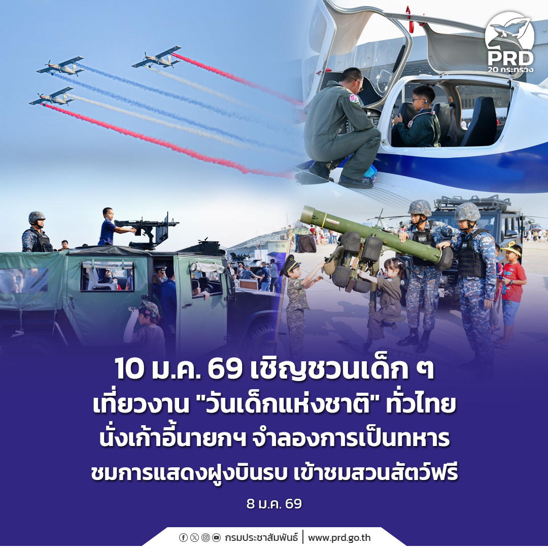 10 ม.ค. 69 เชิญชวนเด็ก ๆ เที่ยวงาน “วันเด็กแห่งชาติ” ทั่วไทย นั่งเก้าอี้นายกฯ จำลองการเป็นทหาร ชมการแสดงฝูงบินรบ เข้าชมสวนสัตว์ฟรี