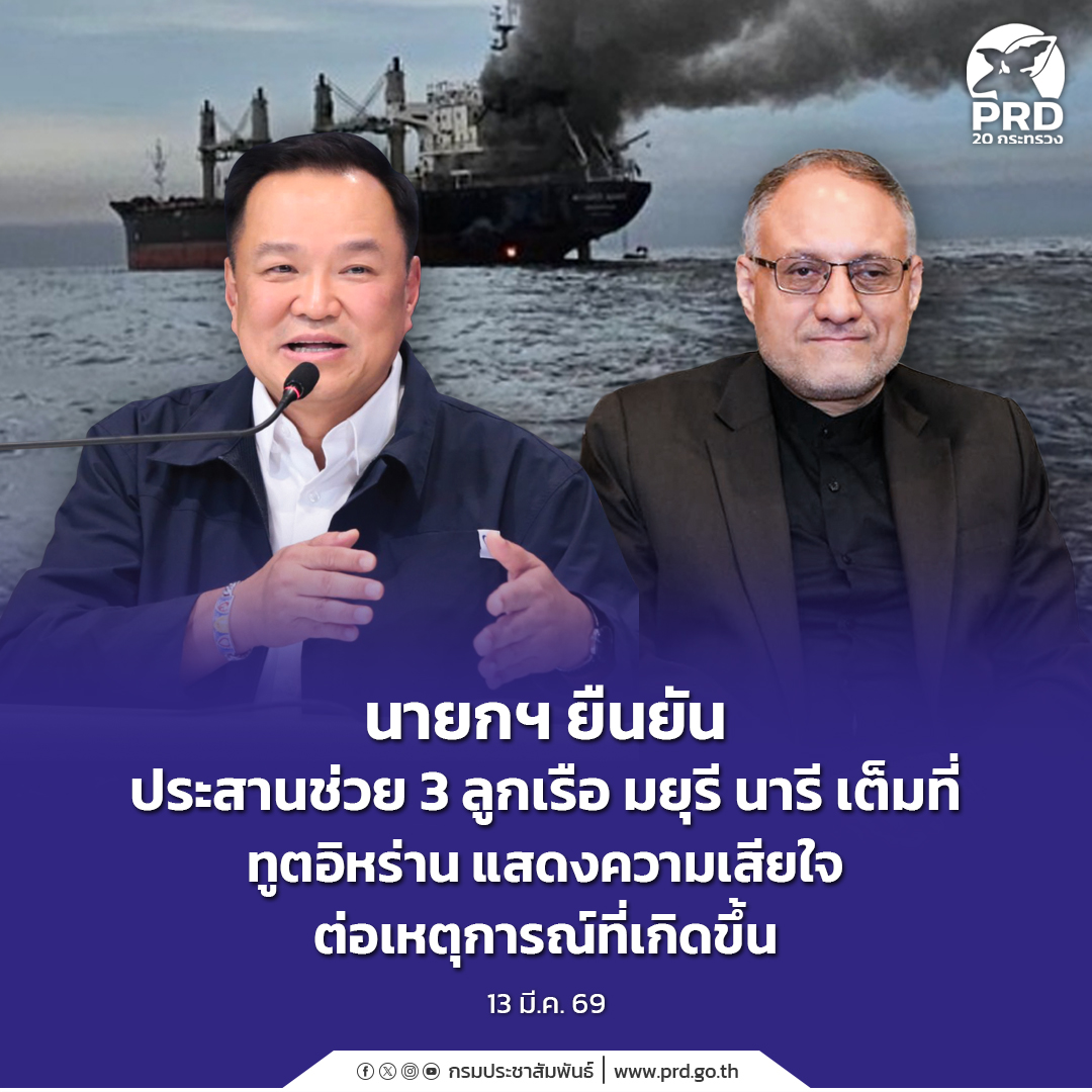 (12 มี.ค. 69) นายอนุทิน ชาญวีรกูล นายกรัฐมนตรีและรัฐมนตรีว่าการกระทรวงมหาดไทย กล่าวถึงความคืบหน้าการช่วยเหลือลูกเรือคนไทย 3 คนที่สูญหาย จากเหตุเรือบรรทุกสินค้าสัญชาติไทย ชื่อ “มยุรี นารี” ถูกโจมตี ระหว่างเดินเรือในทะเลบริเวณช่องแคบฮอร์มุซ ว่า ทางกระทรวงการต่างประเทศ และกระทรวงคมนาคมได้ประสานให้ความช่วยเหลืออย่างเต็มที่ ส่วนความปลอดภัยของลูกเรือไทยทั้ง 3 คน นายสีหศักดิ์ พวงเกตุแก้ว รัฐมนตรีว่าการกระทรวงการต่างประเทศ ได้หารือทางโทรศัพท์กับรัฐมนตรีต่างประเทศโอมาน โดยนายกรัฐมนตรี ได้โพสต์เฟสบุ๊ก ระบุว่าได้ร่วมรับฟังการสนทนาระหว่าง รัฐมนตรีว่าการกระทรวงการต่างประเทศของไทย กับนายซัยยิด บัดร์ บิน ฮะมัด บิน ฮะมูด อัลบูซัยดี รัฐมนตรีว่าการกระทรวงการต่างประเทศรัฐสุลต่านโอมาน เพื่อขอบคุณ และสอบถามถึงความเป็นอยู่ของลูกเรือ ที่รัฐบาลโอมานได้ให้การช่วยเหลือและมีความปลอดภัยแล้ว กำลังจะดำเนินการให้กลับเมืองไทย ส่วนลูกเรืออีก 3 คนที่ยังสูญหาย รัฐบาลไทยได้ร้องขอให้โอมานได้ช่วยค้นหาและช่วยชีวิตอย่างเต็มที่