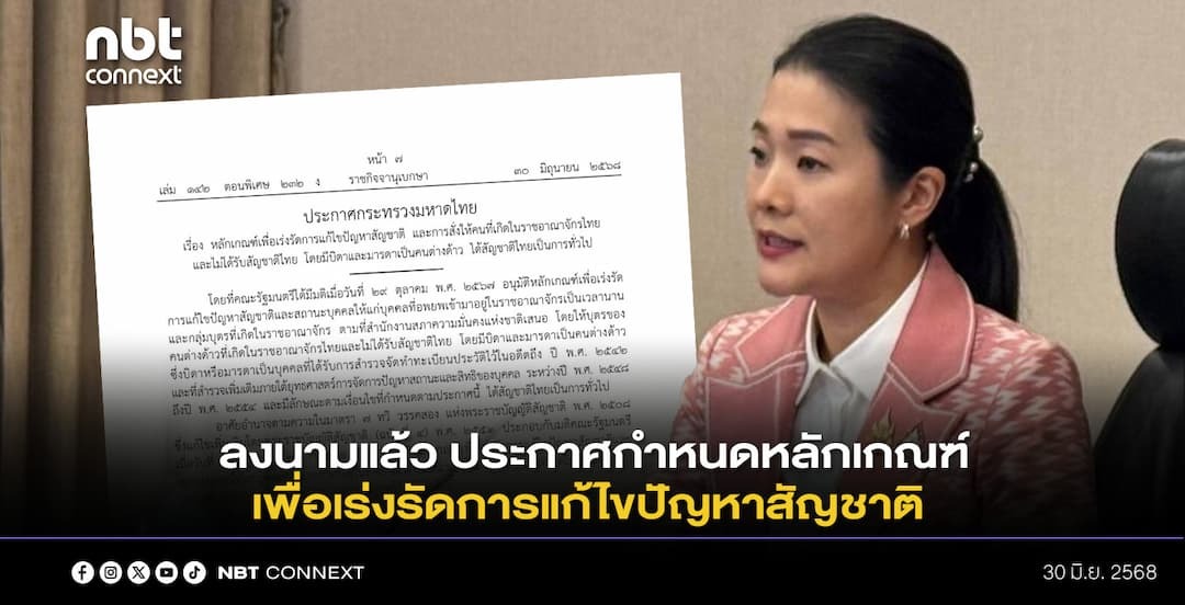 น.ส.ธีรรัตน์ สำเร็จวาณิชย์ รัฐมนตรีช่วยว่าการกระทรวงมหาดไทยรักษาราชการแทนรัฐมนตรีว่าการกระทรวงมหาดไทย เปิดเผยถึงการดำเนินการตามมติคณะรัฐมนตรี (ครม.) เมื่อวันที่ 29 ต.ค. 67 ที่ได้อนุมัติหลักเกณฑ์เพื่อเร่งรัดการแก้ไขปัญหาสัญชาติและสถานะบุคคลให้แก่บุคคลที่อพยพเข้ามาอยู่ในราชอาณาจักรเป็นเวลานาน และกลุ่มบุตรที่เกิดในราชอาณาจักร ตามที่สำนักงานสภาความมั่นคงแห่งชาติเสนอ