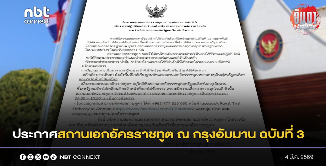 ประกาศสถานเอกอัครราชทูต ณ กรุงอัมมาน ฉบับที่ 3 เรื่อง การปฏิบัติตนสำหรับคนไทยในช่วงสถานการณ์ความขัดแย้งระหว่างอิสราเอลและสหรัฐอเมริกากับอิหร่าน